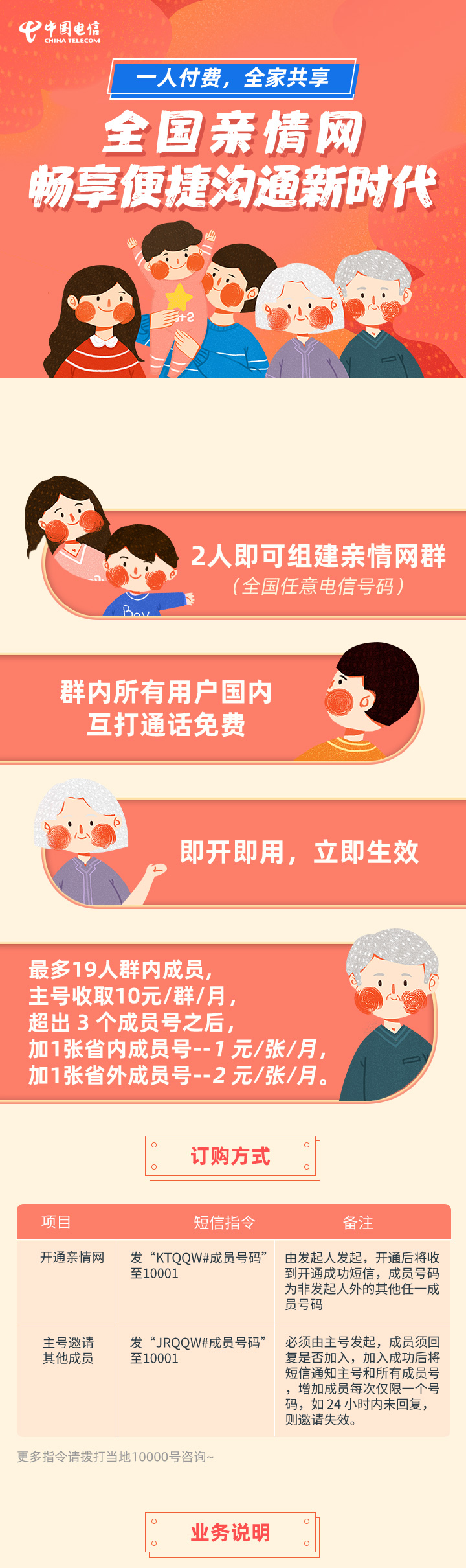 1、组网:只允许中国电信手机用户创建全国亲情网,创建亲情网的号码即为该网的发起人(主号),一个用户只可创建或加入一个亲情网,一个全国亲情网中只能有一个主号。亲情网的成员可以是省内号码,也可以是省外号码,2 个及以上客户即可组网。